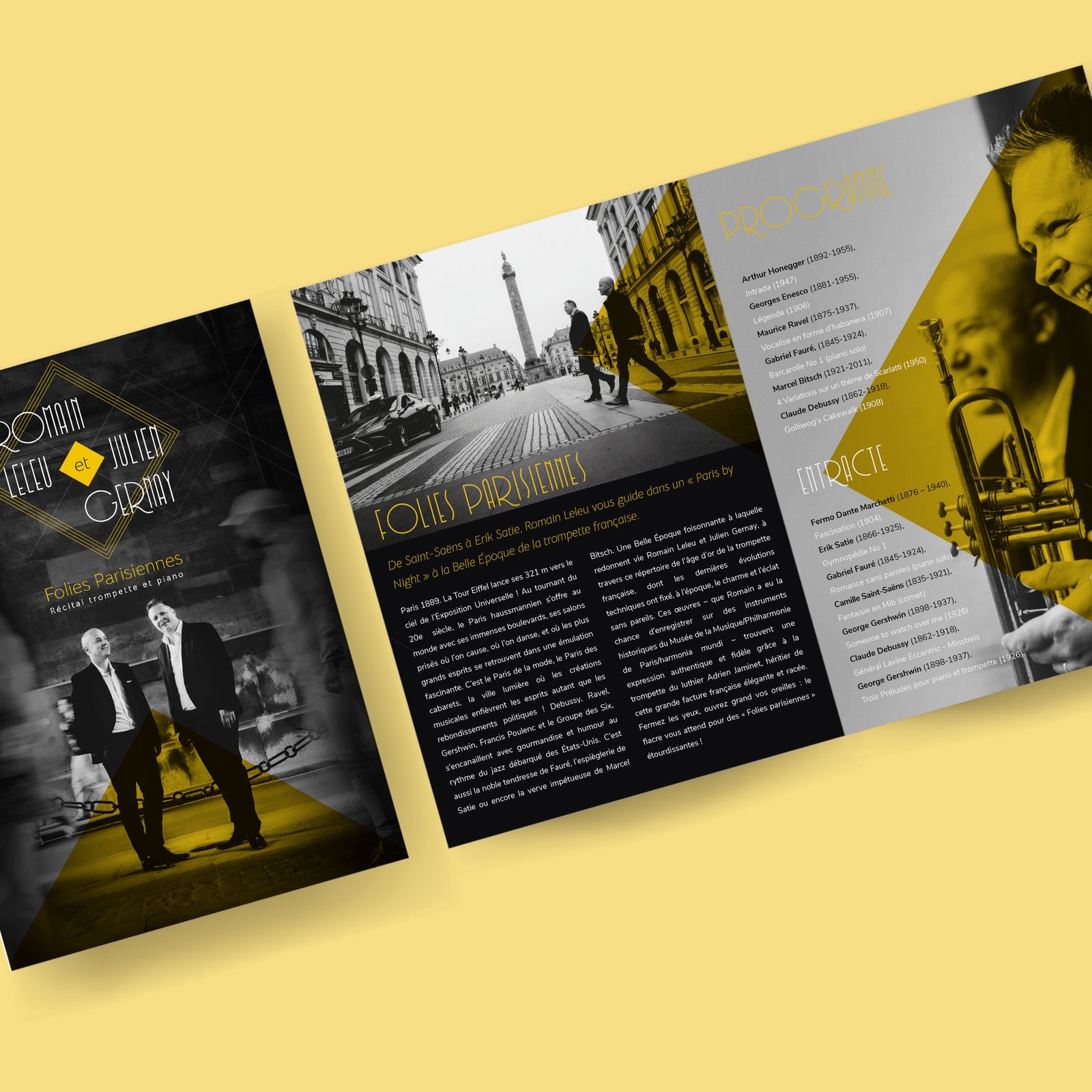 Diseñamos el dossier para Romain Leleu y Julien Gernay, para promocionar su ciclo de conciertos Folies Parisiennes del 2023.